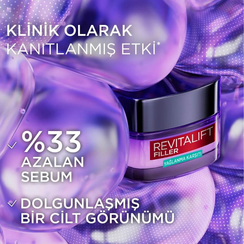 Gelince Haber VerL'Oréal Paris Revitalift Filler, yağlı ve karma ciltler için özel geliştirilmiş, jel bazlı bir nemlendiricidir. Salisilik asit ile gözenek görünümünü azaltırken hyaluronik asit ile cildi yoğun bir şekilde nemlendirir. Cilt yüzeyinde parlama yapmaz; anında mat bir sonuç sunar.