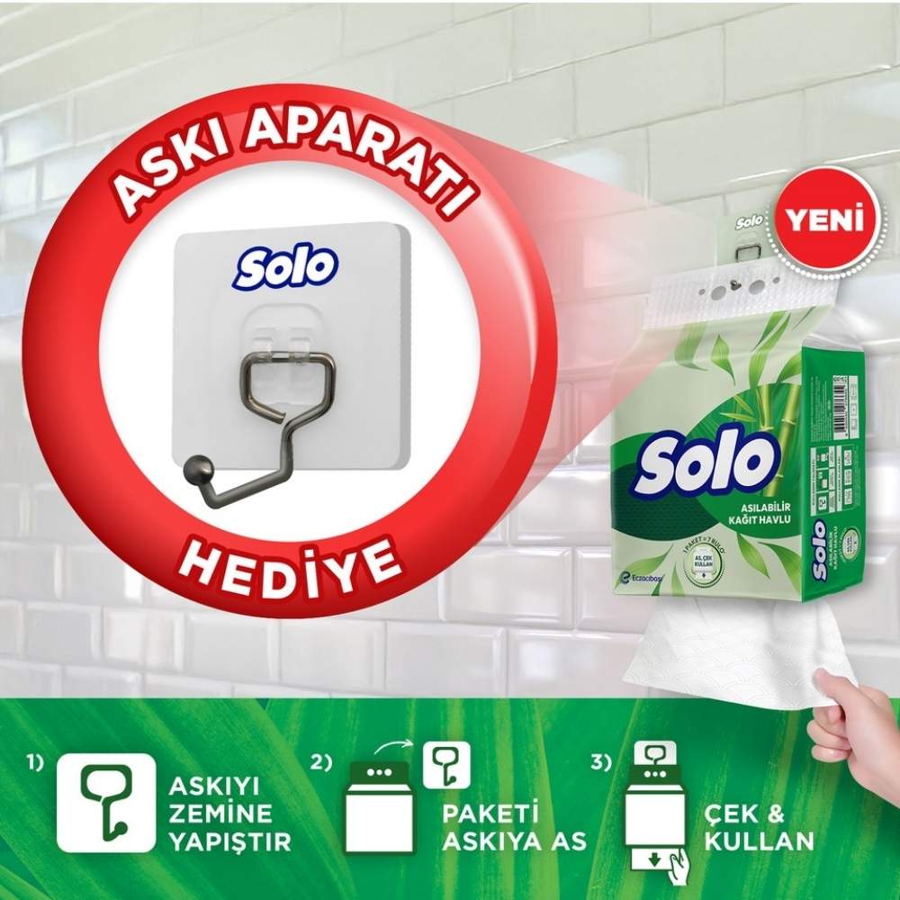 Asılabilir tasarımı sayesinde mutfak veya banyo gibi alanlarda kolay erişim imkânı sunar ve alanı düzenli tutar. Hafif ve sağlam yapısı, rulo açıldığında da dağılmadan kullanım sağlar. Solo Asılabilir Kağıt Havlu, pratikliği, yüksek emiciliği ve ekonomik avantajı bir araya getirerek günlük temizlik ve bakım rutinlerinde güvenle tercih edilebilecek bir üründür.
